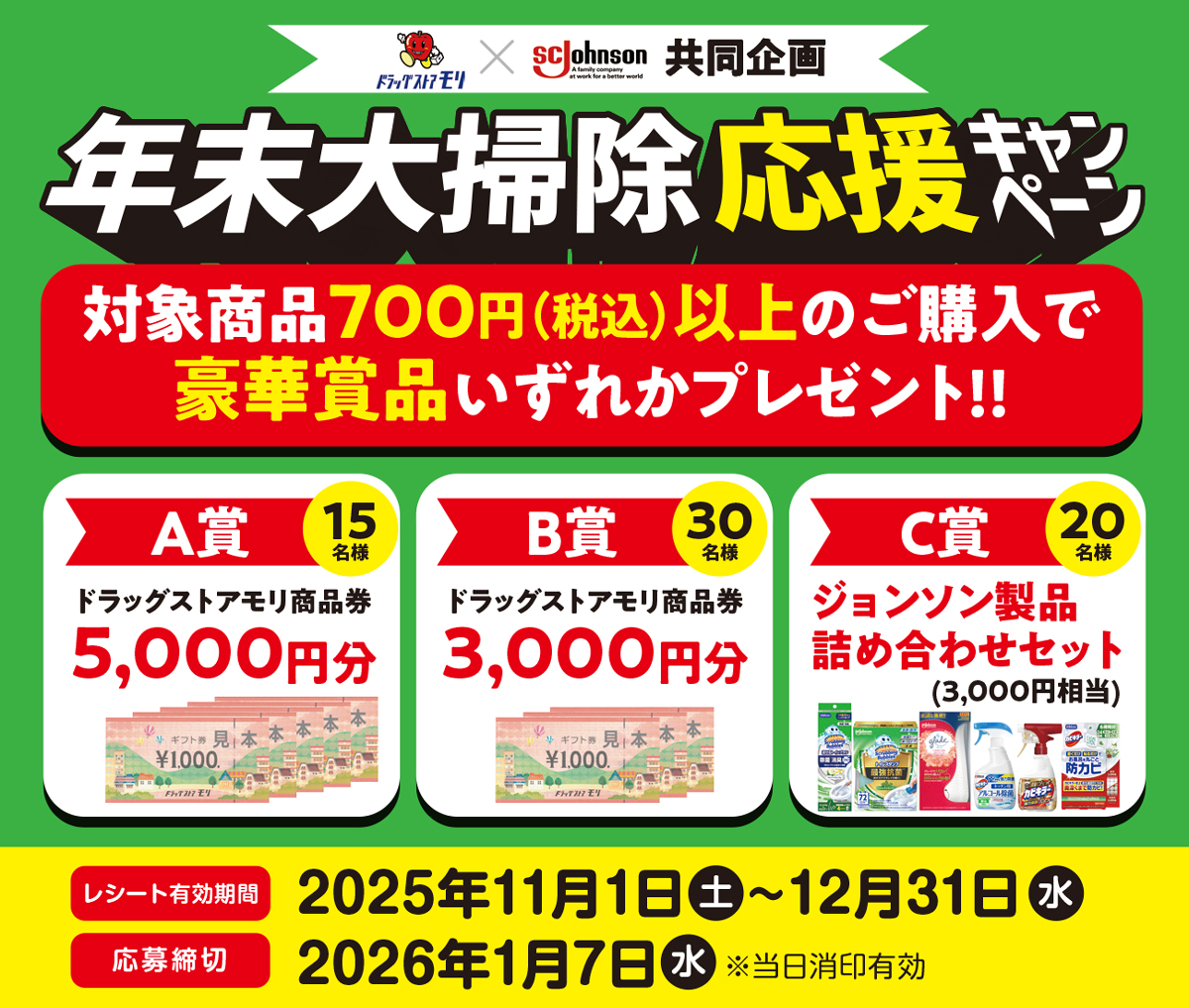 ドラッグストアモリで、ジョンソンブランド全商品を合計700円(税込)以上のレシートを、専用 応募ハガキ(所定金額の切手をお貼りください)または市販のハガキにしっかりと貼り、①郵便番号 ②ご住所③お電話番号④お名前⑤年齢⑥性別⑦ご購入店をご記入の上ご応募ください。